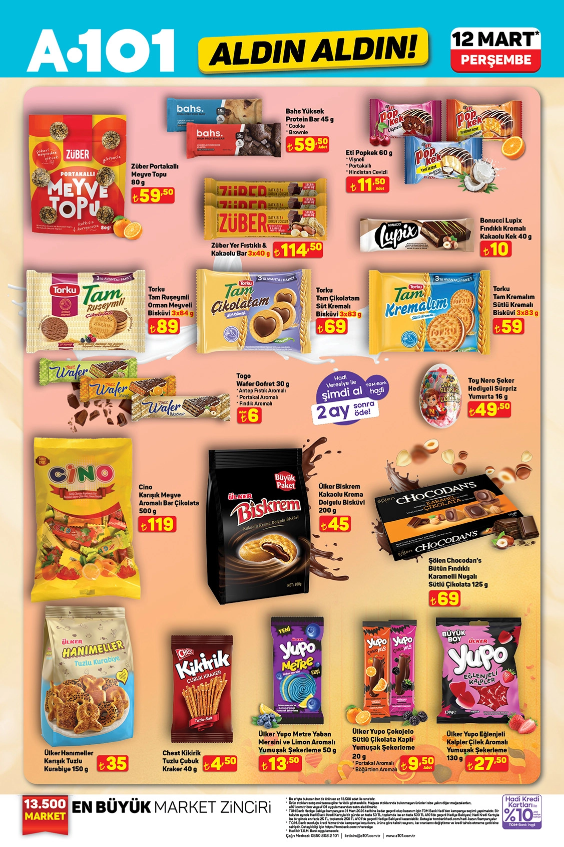 A101 12 Mart 2026 Kataloğun son sayfasında Züber Meyve Topu 59,50 TL, Eti Popkek çeşitleri 11,50 TL. Torku bisküvi çeşitleri 59 TL’den başlayan fiyatlarla sunuluyor. Çocuklar için Yupo Yumuşak Şekerlemeler 9,50 TL’den başlayan fiyatlarla atıştırmalık reyonunda yerini alıyor.