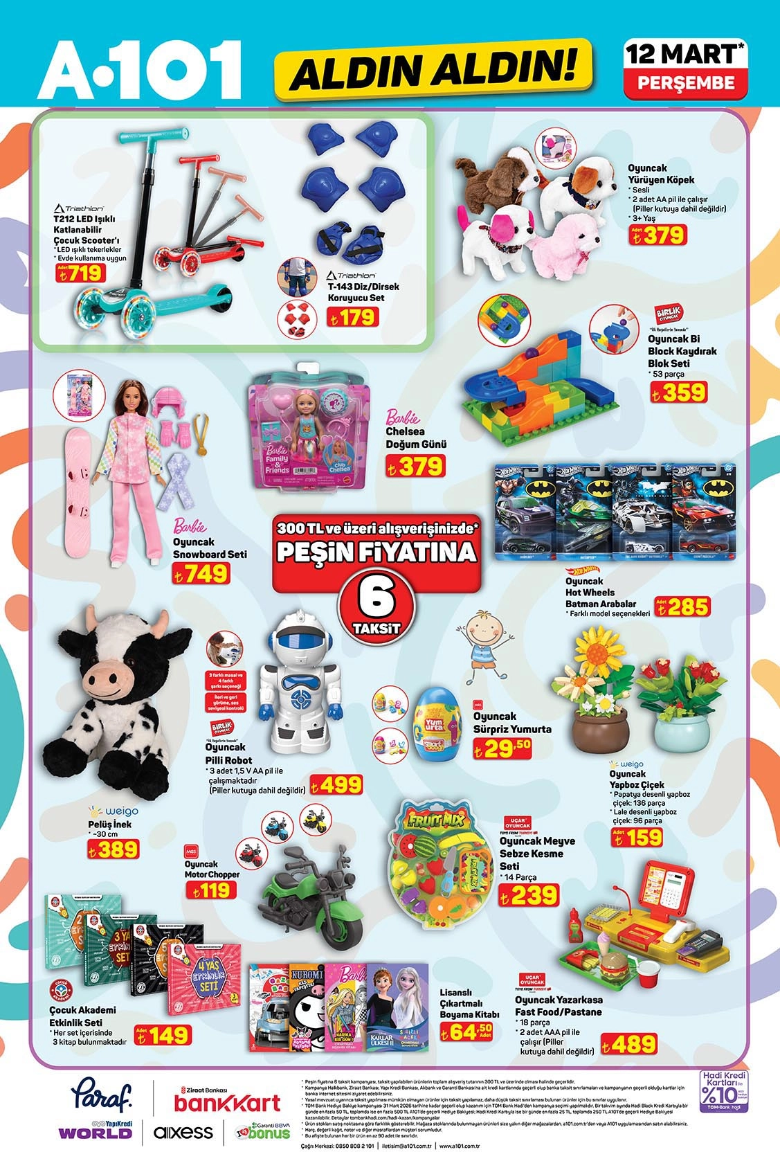 A101 12 Mart 2026, Çocukları sevindirecek pek çok seçenek mevcut. Triathlon T212 LED Işıklı Katlanabilir Scooter 719 TL. Barbie Snowboard Seti 749 TL ve Barbie Chelsea Doğum Günü seti 379 TL. Hot Wheels Batman Arabalar adet 285 TL iken, Pilli Robot 499 TL ve Oyuncak Yazarkasa seti 489 TL fiyatla ebeveynlerin beğenisine sunuluyor.