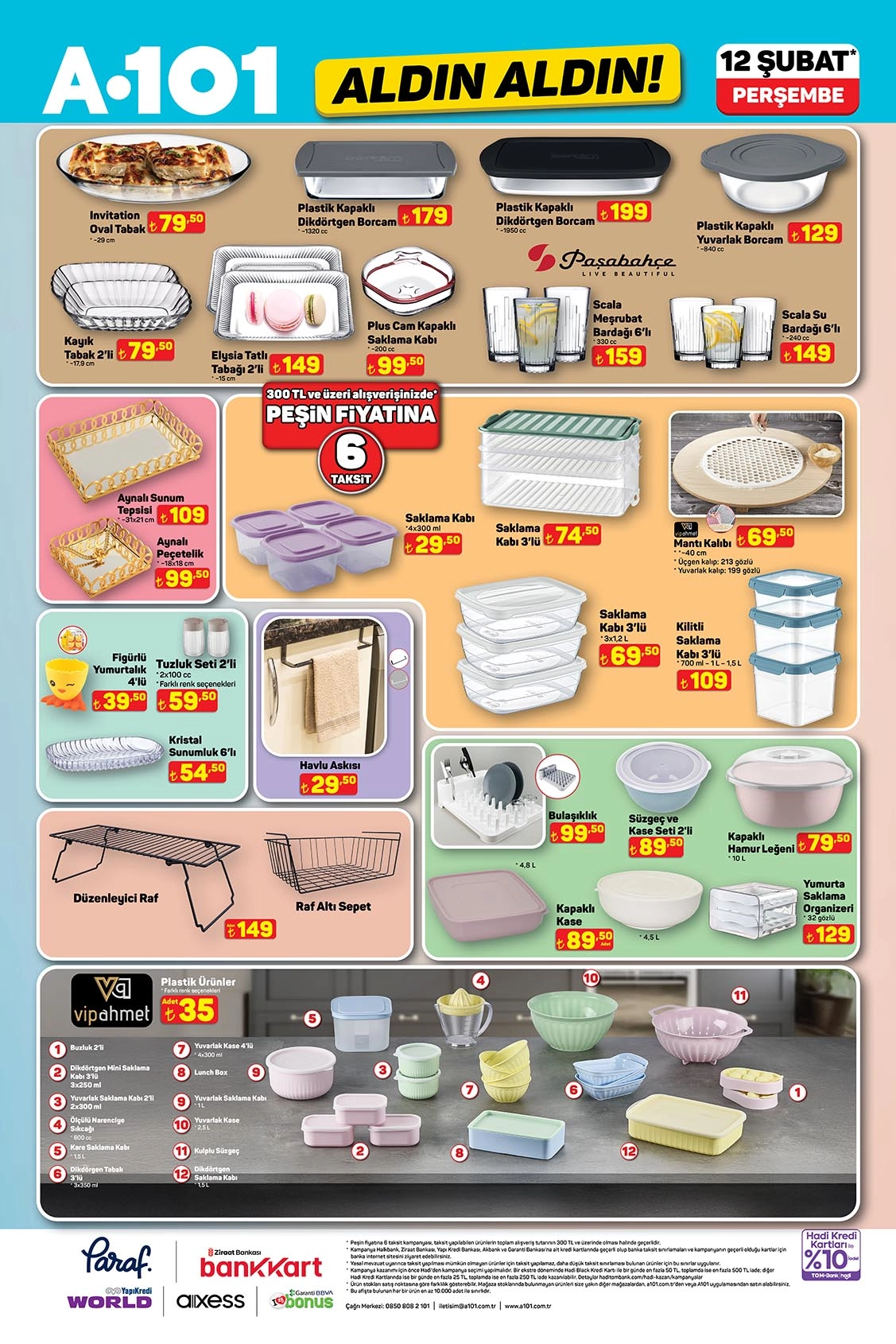 A101 12 Şubat 2026 kataloğunda ev düzenine önem verenler için saklama kapları, organizerler ve mutfak gereçleri bulunuyor. Cam saklama kapları, plastik düzenleyiciler ve çok amaçlı mutfak ürünleri hem pratik hem de uygun fiyatlı seçenekler sunuyor. Ürün fiyatları genellikle 59 TL – 179 TL bandında.