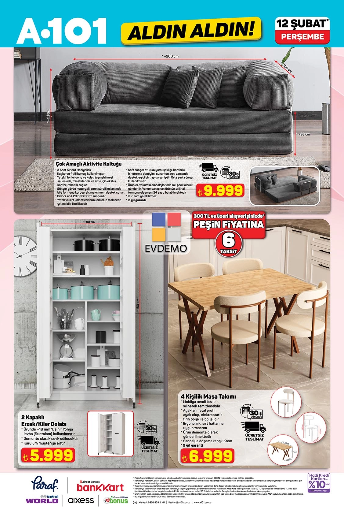A101 12 Şubat 2026 katalogun en dikkat çeken bölümlerinden biri. 3’lü Koltuk, modern tasarımı ve geniş oturum alanıyla 9.999 TL fiyatla satışta. Ayrıca yemek masası takımı ve çok amaçlı dolaplar evini yenilemek isteyenler için cazip seçenekler sunuyor. Dolap fiyatı 5.999 TL, masa takımı ise 6.999 TL.