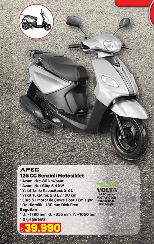 A101 2 Nisan 2026 Ulaşım Araçları kataloğunda yer alan bir diğer ulaşım aracı ise Apec 125 CC benzinli motosiklet modeli oluyor. Günlük kullanım için tasarlanan bu motosiklet özellikle ekonomik yakıt tüketimi ve pratik şehir içi kullanımı ile öne çıkıyor.