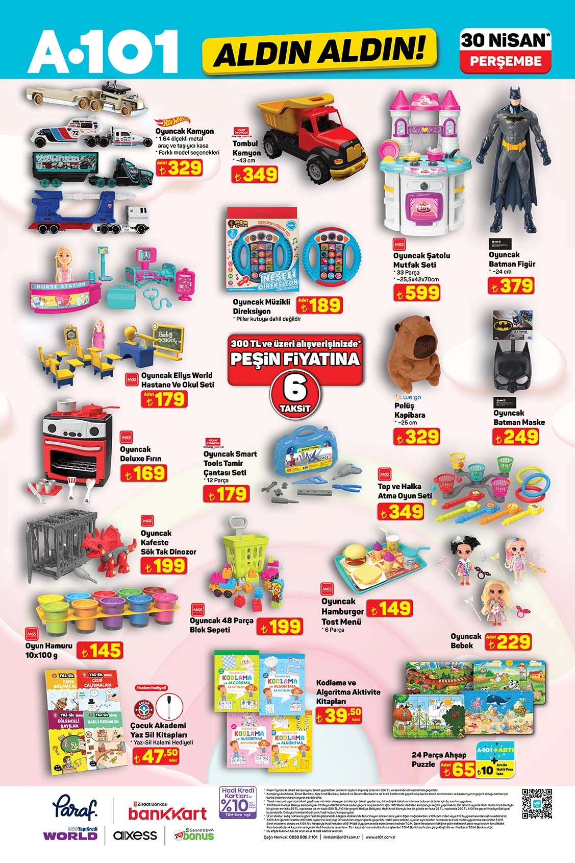 A101 30 Nisan 2026 çocuk oyuncakları, eğitici kitap setleri ve puzzle çeşitleri Çocukları sevindirecek onlarca çeşit oyuncak arasında Batman figürleri 379 TL, oyuncak şatolu mutfak setleri 599 TL ve eğitici kodlama kitapları sadece 39,50 TL ile raflarda yerini alıyor.