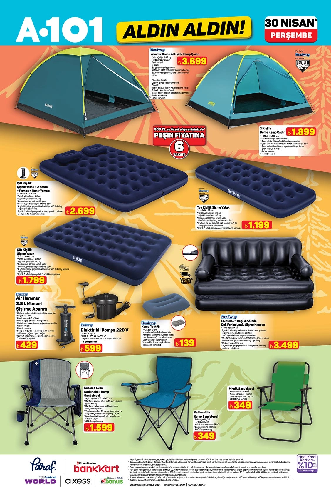 A101 30 Nisan 2026 Bestway kamp çadırı, şişme yatak ve piknik malzemeleri Yaz kampı planları yapanlar için Bestway 4 kişilik çadır 3.699 TL. Konforlu bir kamp deneyimi için gereken şişme yataklar ve katlanır sandalyeler ise 349 TL’den başlayan fiyatlarla sizi doğaya davet ediyor.