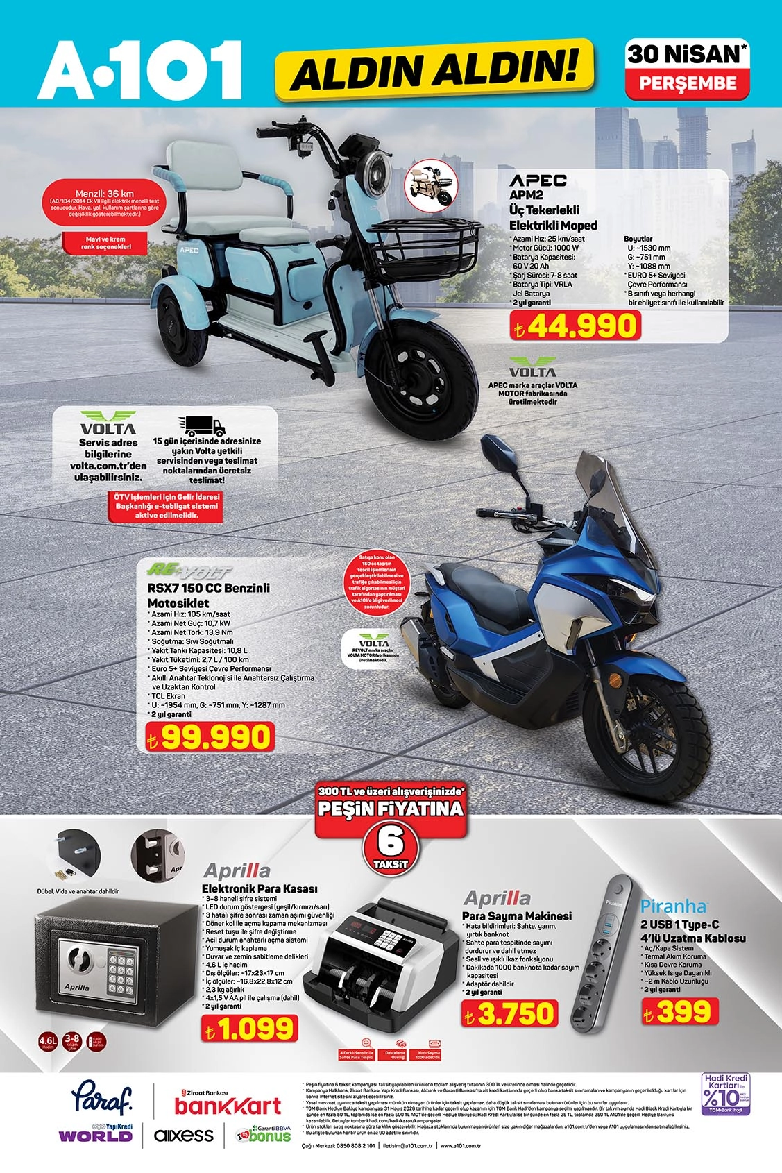 A101 30 Nisan 2026 APEC elektrikli moped ve Revolt benzinli motosiklet fiyatları Kişisel ulaşımda devrim yaratmaya devam eden A101, APEC AP2 Üç Tekerlekli Elektrikli Moped’i 44.990 TL’ye raflara çıkarıyor. Daha güçlü motor arayanlar için ise 99.990 TL’lik Revolt RSX7 150 CC benzinli motosiklet seçenekler arasında.