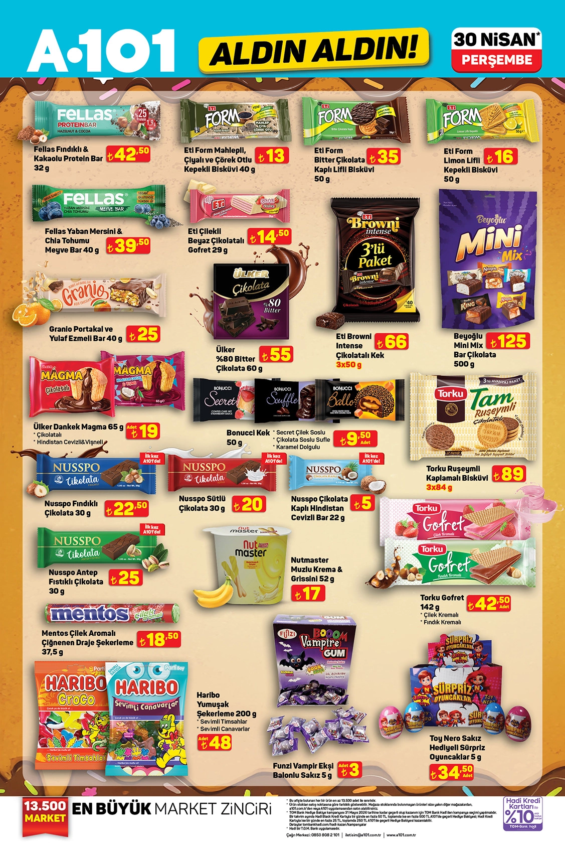 A101 30 Nisan 2026 Fellas protein bar, Eti ürünleri ve atıştırmalık fırsatları Sağlıklı atıştırmalıklar arayanlar için Fellas protein barlar 42,50 TL. Eti ve Ülker’in en sevilen çikolata ve bisküvi çeşitleri de cazip fiyatlarla market raflarındaki yerini alıyor.