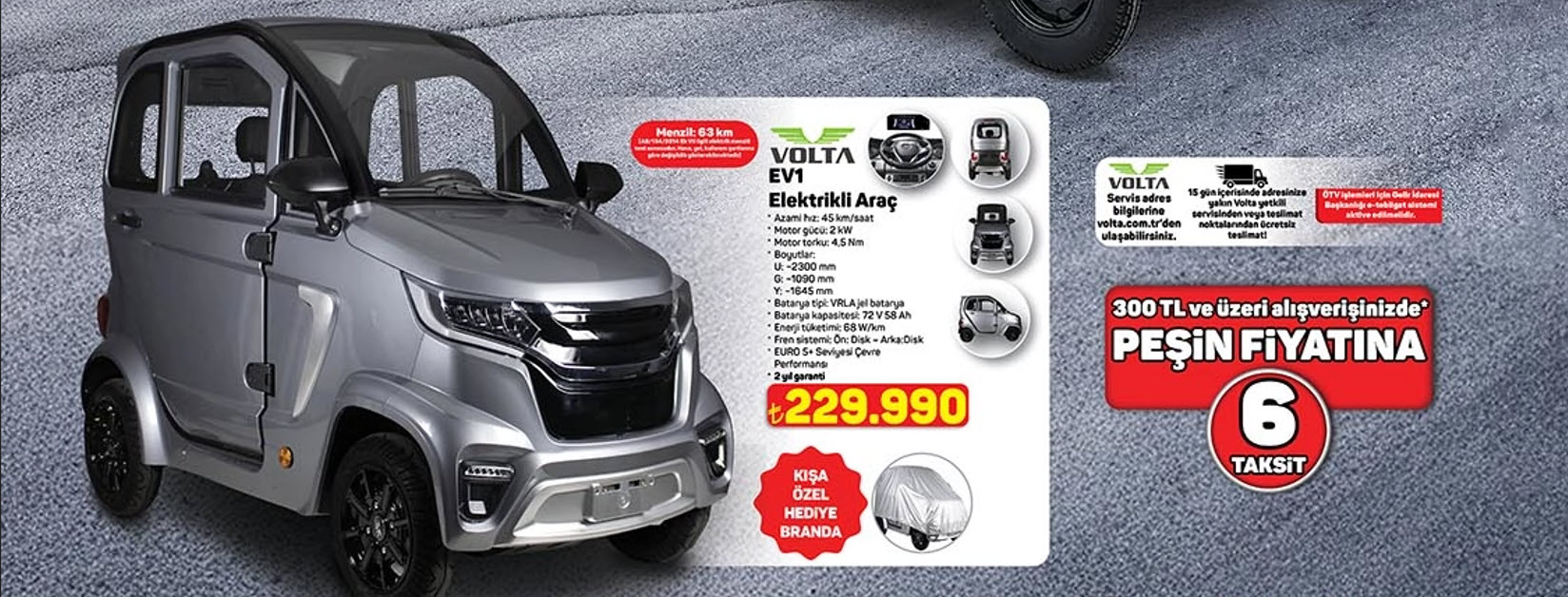 Volta EV1 Elektrikli Araç, bu kampanya döneminde 229.990 TL‘den alıcı bulacak. Üstelik 300 TL ve üzeri alışverişlerde sunulan peşin fiyatına 6 taksit imkanı bu araç için de geçerli.