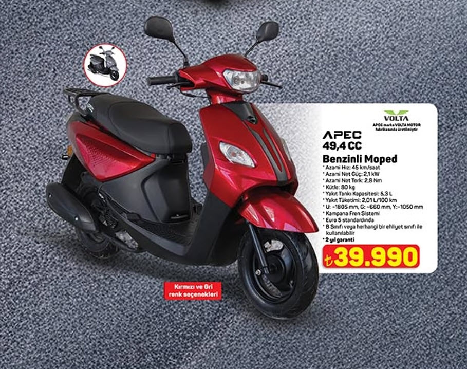 A101 5 Şubat 2026 Ulaşım Araçları, B sınıfı ehliyetle kullanılabilmesi sebebiyle geniş bir kitleye hitap eden APEC 49,4 CC Benzinli Moped, kataloğun ulaşılabilir fiyatlı modellerinden biri.