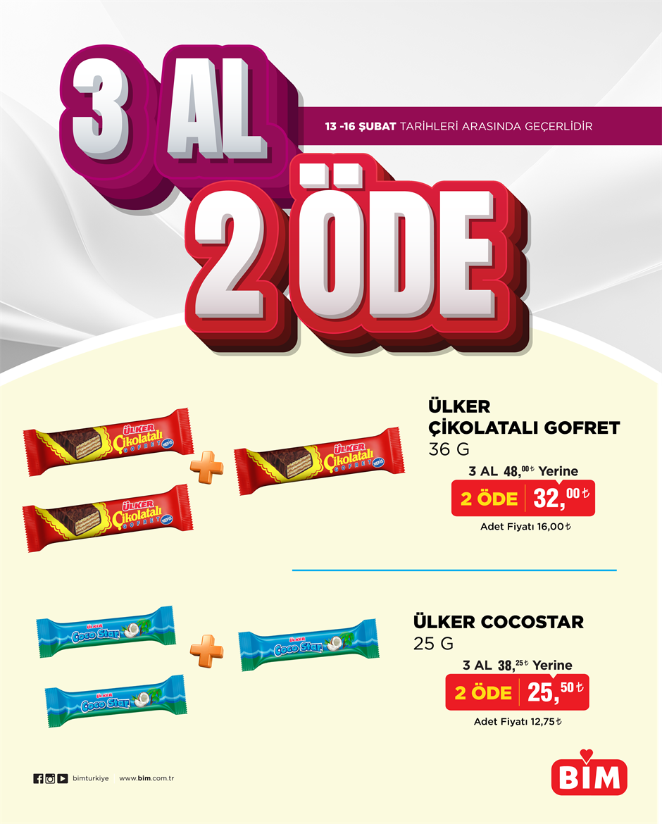 Bim 13 Şubat İkinci katalog sayfasında çikolata severleri hedefleyen “3 al 2 öde” kampanyası dikkat çekiyor. Özellikle klasik lezzetleriyle bilinen Ülker markalı çikolatalı gofret 36 gramlık paketlerde sunuluyor. Normalde 3 adet için 48 TL olan ürün, kampanya kapsamında 2 öde 32 TL fiyatla satın alınabiliyor. Bu durum adet fiyatını ciddi şekilde düşürerek çoklu alışverişi cazip hale getiriyor.
