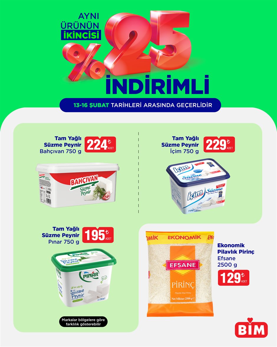 Bim 13 Şubat Son katalog sayfasında kahvaltılık ve temel gıda kategorisindeki indirimler dikkat çekiyor. 750 gramlık tam yağlı süzme peynir çeşitleri farklı markalarla sunulmuş. Bahçıvan süzme peynir 224 TL, İçim süzme peynir 229 TL ve Pınar süzme peynir 195 TL fiyat etiketleriyle raflarda yer alıyor. Yumuşak kıvamı ve kahvaltıya uygun yapısıyla süzme peynirler özellikle hafta sonu sofralarının vazgeçilmezleri arasında bulunuyor.