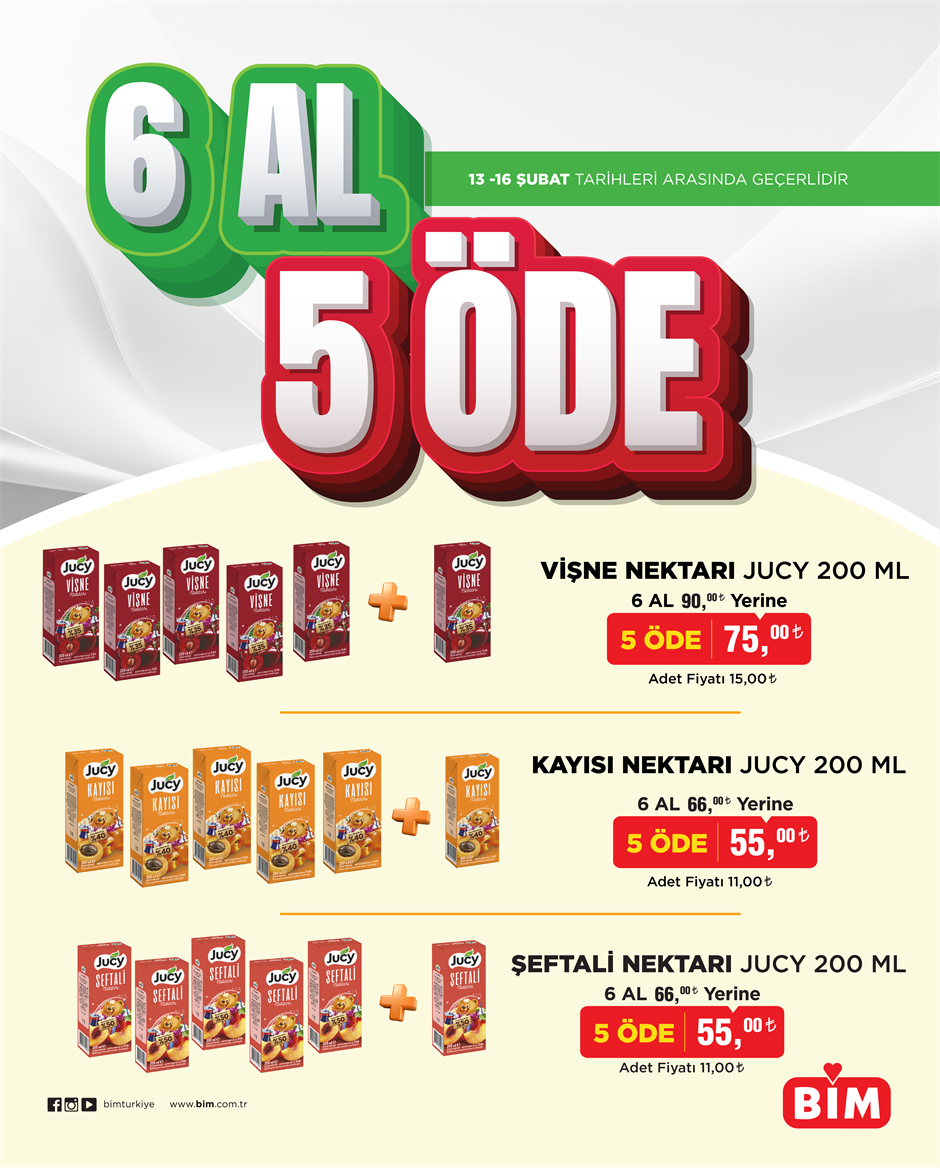 Bim 13 Şubat Üçüncü sayfada ise içecek kategorisinde toplu alım kampanyası öne çıkıyor. 200 ml’lik kutularda sunulan Jucy meyve nektarları, farklı aromalarıyla dikkat çekiyor. Vişne nektarı için 6 al 90 TL yerine 5 öde 75 TL kampanyası uygulanırken, adet fiyatı yaklaşık 15 TL seviyesine düşüyor.