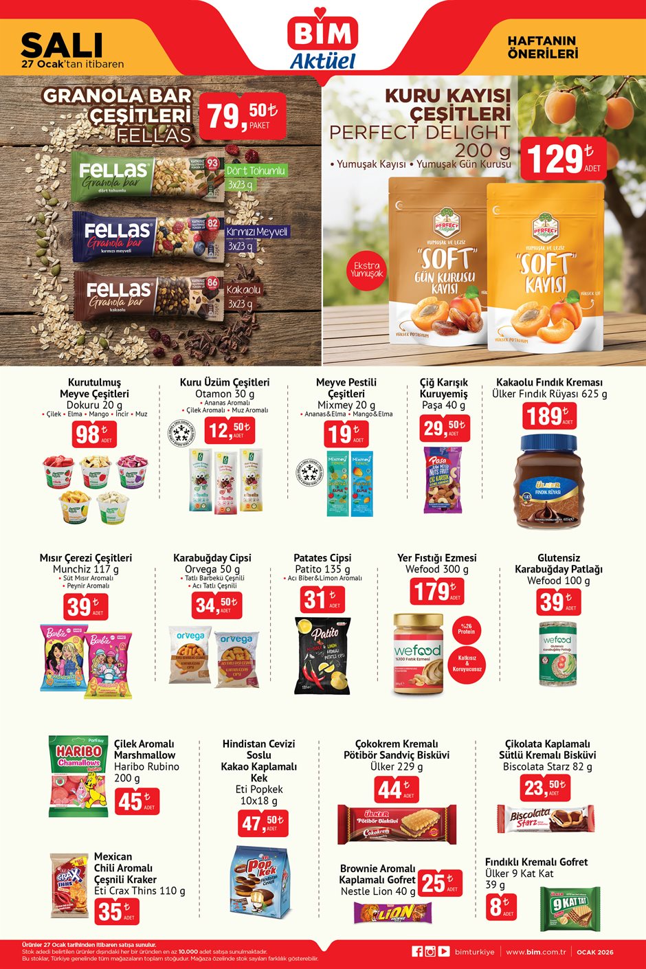 Ara öğünler ve atıştırmalık sevenler için BİM bu hafta oldukça cömert. Fellas Granola Bar Çeşitleri 79,50 TL iken, meyve kurularında Perfect Delight Kuru Kayısı Çeşitleri (200 g) 129 TL fiyatıyla sağlıklı bir alternatif sunuyor. Çikolata ve bisküvi tutkunları için Ülker Fındık Rüyası (625 g) 189 TL, Ülker Çokokrem Kremalı Pötibör 44 TL ve Biscolata Starz (82 g) 23,50 TL.