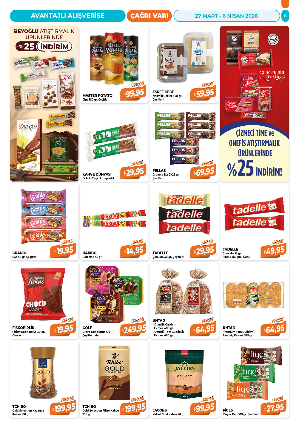 Ülker, Eti, Şölen ve Nestlé markalarının en sevilen ürünleri bu Çağrı Market 27 Mart 2026 katalogda bir araya gelmiş. Ülker Çokokrem (440 gr) 99,95 TL, Nestlé Damak Kare Çikolata ise 69,95 TL fiyatıyla tatlı krizlerine çözüm sunuyor. Çocuklar için de Eti Cici Bebe (700 gr) 124,95 TL avantajlı fiyatıyla raflarda.