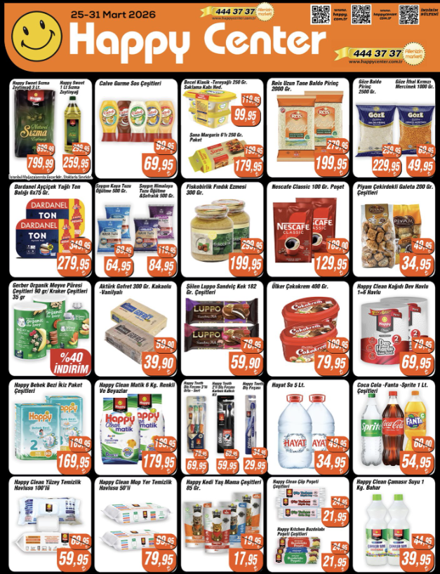 Happy Center 25 Mart 2026 aktüel kataloğu açıklandı. Ayçiçek yağı, kahve, dondurma, temizlik ve gıda ürünlerinde dikkat çeken indirimler burada.