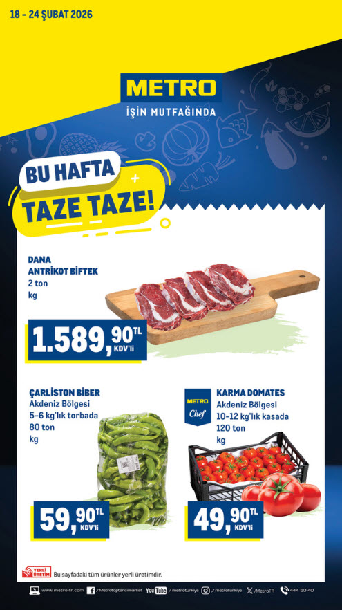 Metro Market, 18 Şubat 2026 tarihleri arasında geçerli “Bu Hafta Taze Taze!” kampanyasıyla et, balık, sebze, meyve ve şarküteri ürünlerinde dikkat çeken fiyatlar sunuyor. Profesyonel mutfaklara ve toplu alım yapan işletmelere hitap eden bu katalogda hem yüksek gramajlı ürünler hem de Metro Chef markalı özel seçenekler öne çıkıyor. İşte Metro Market 18 Şubat 2026 kataloğunda yer alan ürünlerin detaylı incelemesi…