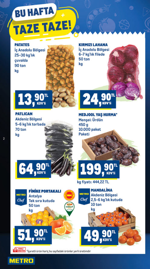 Metro Market 18 Şubat 2026 aktüel kataloğu; et, balık, sebze ve meyvede geniş ürün yelpazesi sunuyor. Özellikle toplu alım yapan işletmeler için yüksek tonajlı ürün seçenekleri ve Metro Chef markalı pratik çözümler dikkat çekiyor. Uygun fiyatlı patates ve piliç gibi temel ürünlerden premium antrikot ve somona kadar her bütçeye hitap eden alternatifler mevcut.