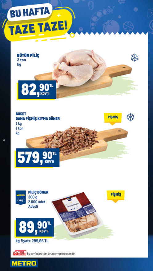 Metro Market 4 Mart 2026 aktüel ürünler kataloğunda dana rulo döş, kuzu kuşbaşı, piliç ürünleri, balık çeşitleri ve taze sebze meyve indirimleri!