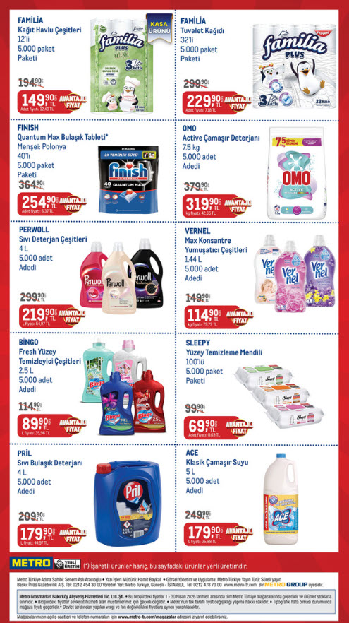 Metro Market Nisan Kataloğunda özellikle ev alışverişi yapanların ilgisini çekecek ürünler öne çıkıyor. Büyük paketli temizlik ürünleri, marka kişisel bakım ürünleri ve bebek bakım ürünleri uygun fiyatlarla satışta olacak.