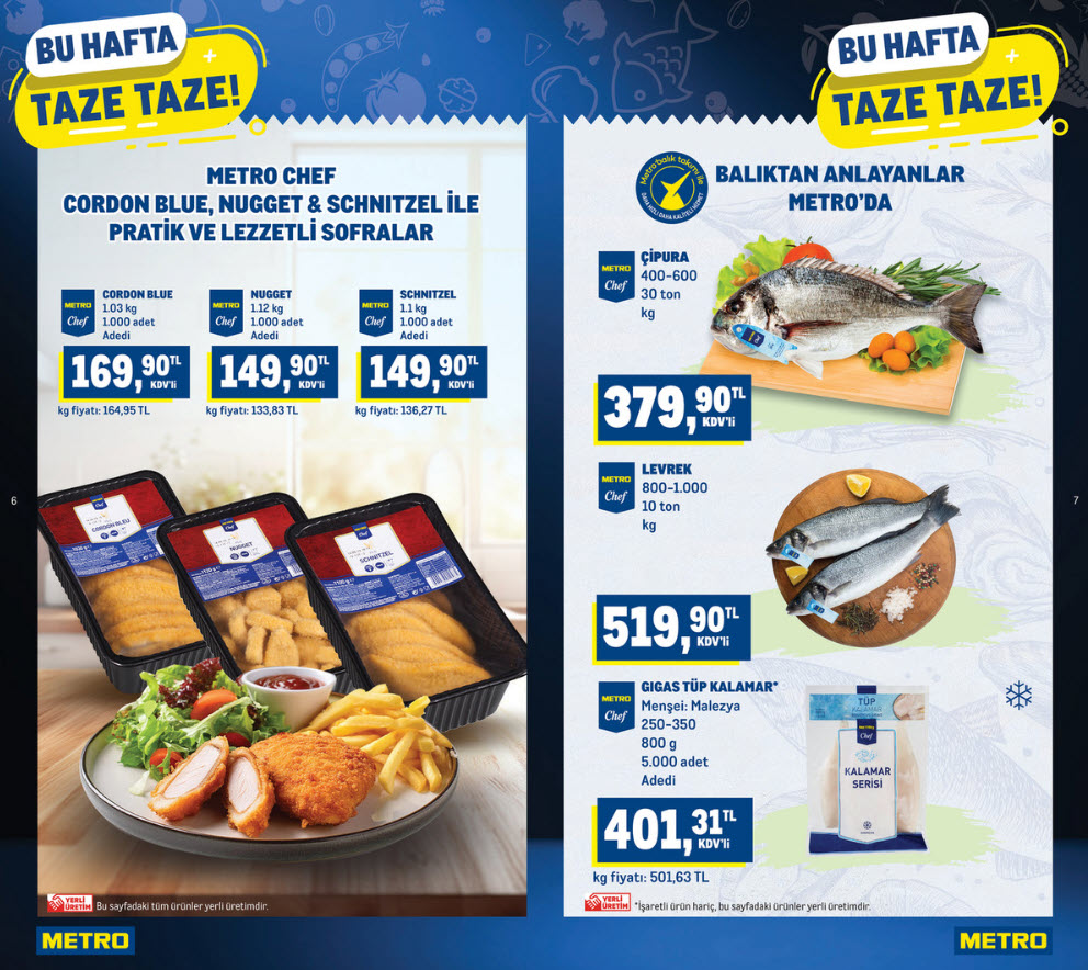 - Metro Chef Tavuk Ürünleri: Cordon Bleu (1.03 kg) 169,90 TL, Nugget (1.12 kg) 149,90 TL ve Schnitzel (1.1 kg) 149,90 TL fiyatlarla dondurulmuş ürünler reyonunda yer alıyor.