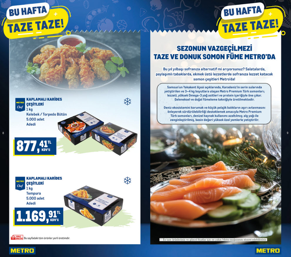 - Deniz Ürünleri Kaplamaları: Metro Chef markalı Kaplamalı Karides çeşitleri (Kelebek/Torpedo Bütün) 1 kg paket fiyatı 877,41 TL iken, Tempura kaplamalı karides 1.169,91 TL.