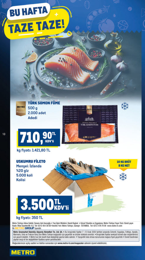 - Gurme Lezzet: Somon Füme: Metro Premium markalı Türk Somon Füme (500 g) dondurulmuş paket fiyatı 710,90 TL. Karadeniz’in serin sularında yetiştirilen bu somonlar, yüksek Omega-3 içeriğiyle sağlıklı bir seçenek sunuyor. Ayrıca 10 kg brüt ağırlığa sahip Uskumru Fileto kolisi 3.500 TL fiyatla satışta.