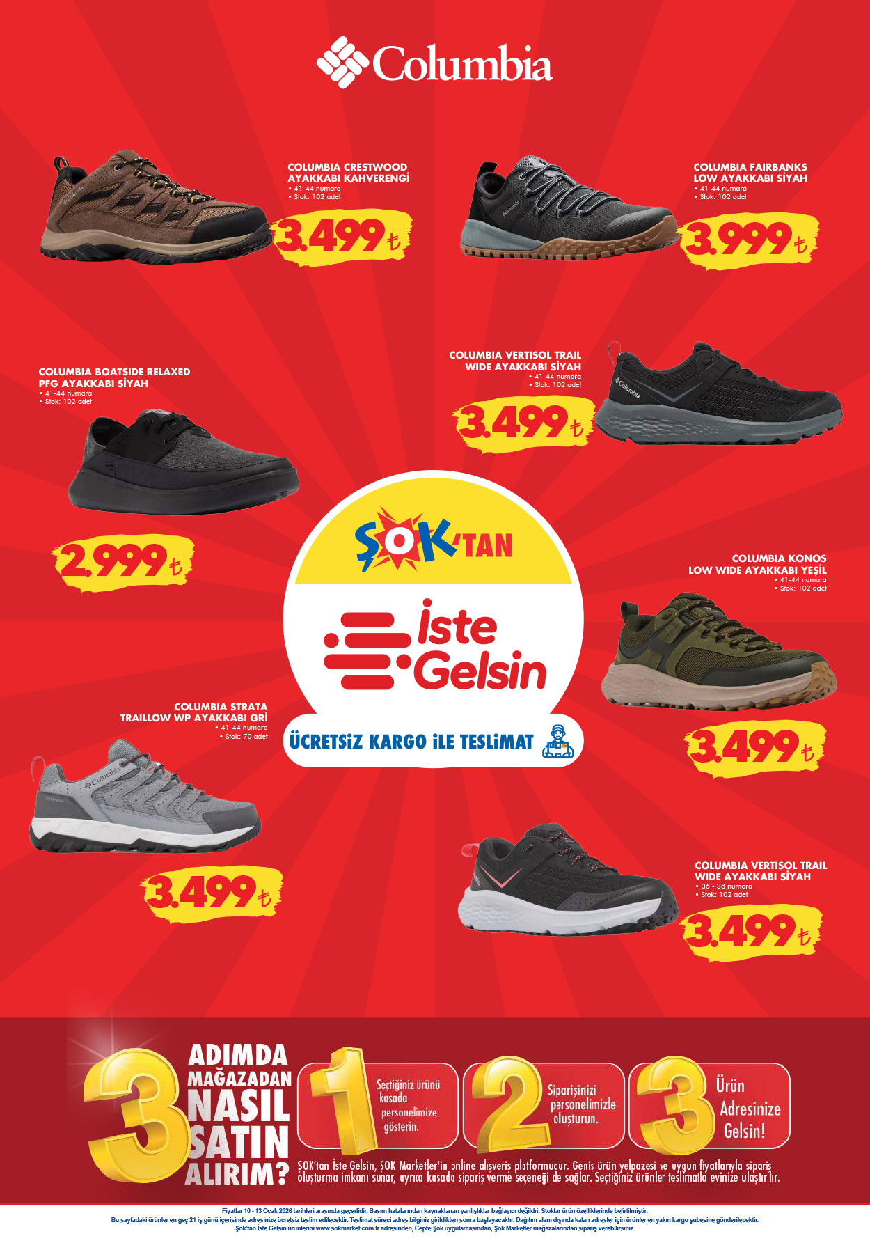 Şok 10 Ocak 2026, online platformu “Şok’tan İste Gelsin” üzerinden dünyaca ünlü outdoor markası Columbia ürünlerini uygun fiyatlarla kapınıza getiriyor. Ücretsiz kargo avantajıyla sunulan bu ürünler, kış ve doğa sporları meraklıları için kaçırılmayacak fırsatlar sunuyor.