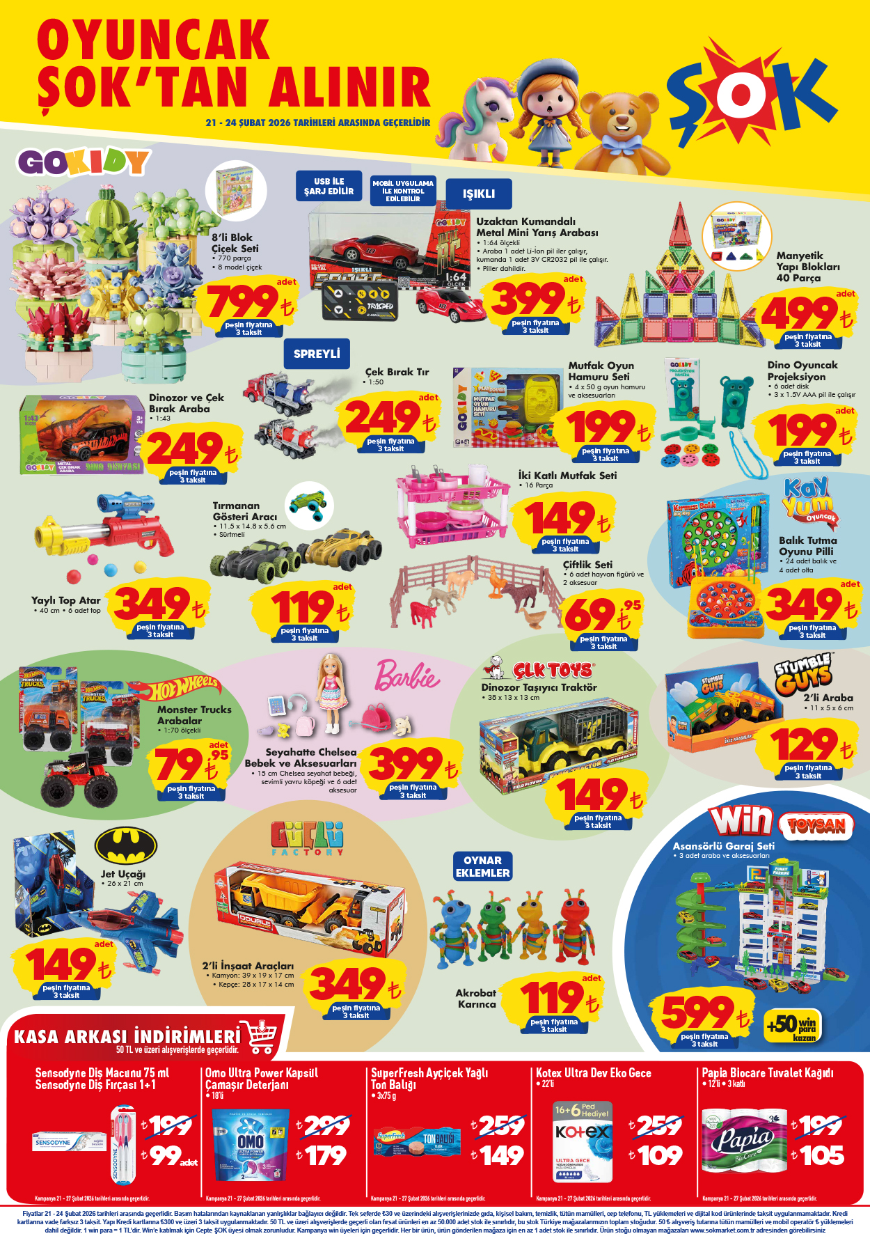 Şok 21 Şubat 2026  kataloğu “Şok’tan Alınır” sloganıyla hazırlanan oyuncak sayfası, hem eğitici hem eğlenceli ürünleri bir arada sunuyor.