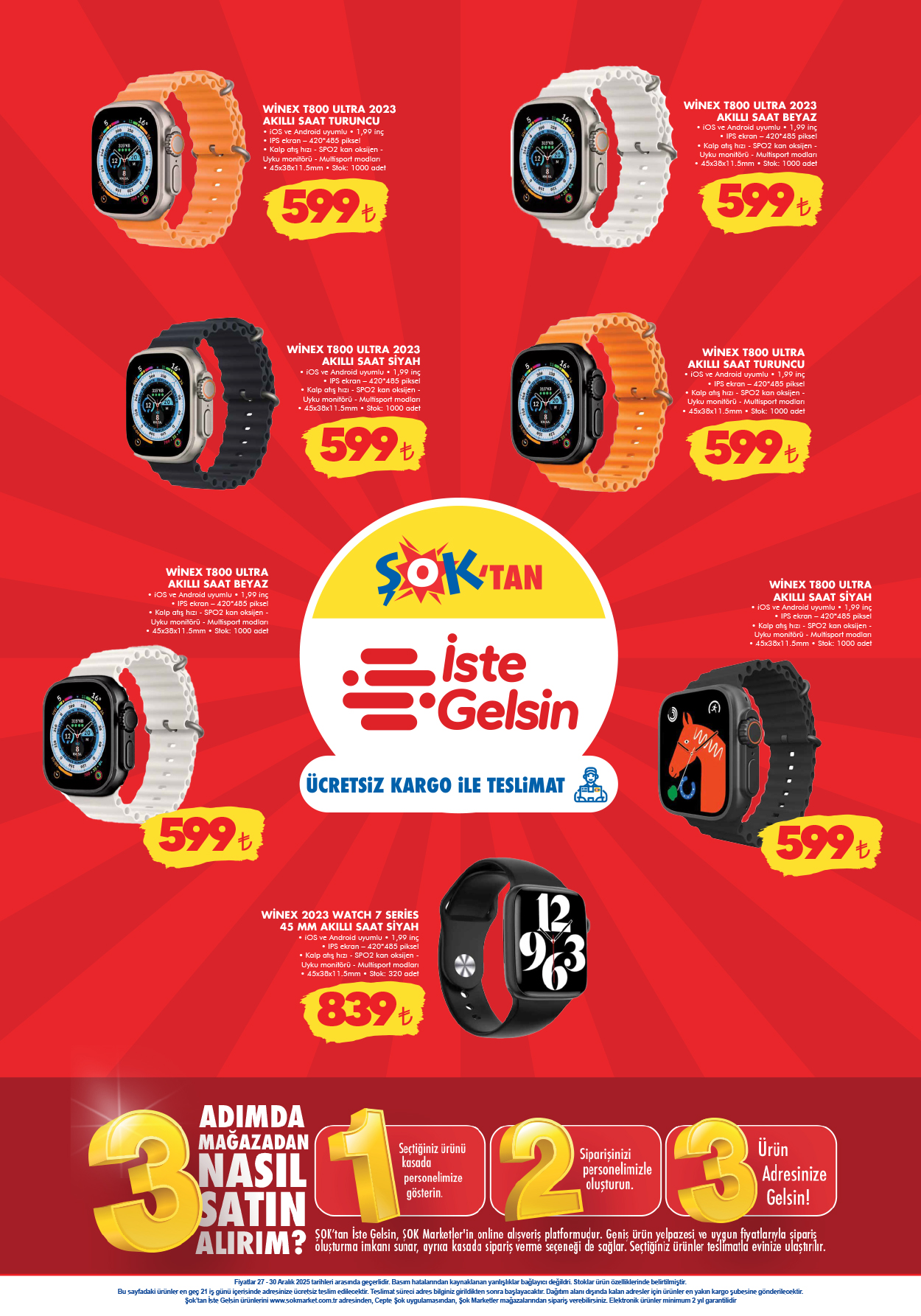 Şok 27 Aralık 2025 dijital platformu üzerinden verilen siparişlerde ücretsiz kargo avantajıyla sunulan akıllı saatler, teknoloji severleri bekliyor.