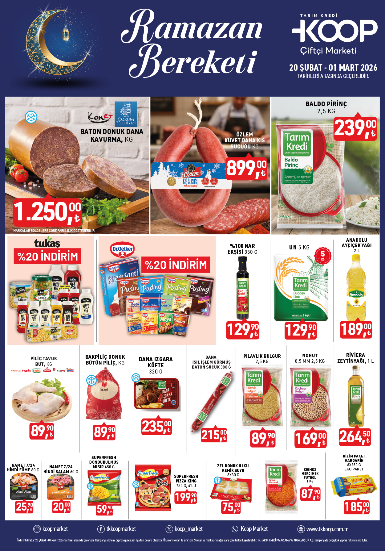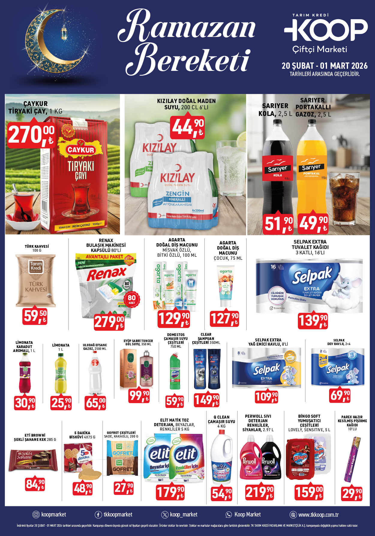 Tarım Kredi Market 20 Şubat 2026 İlk katalog sayfasında Ramazan ayının vazgeçilmez ürünleri ön plana çıkıyor.
